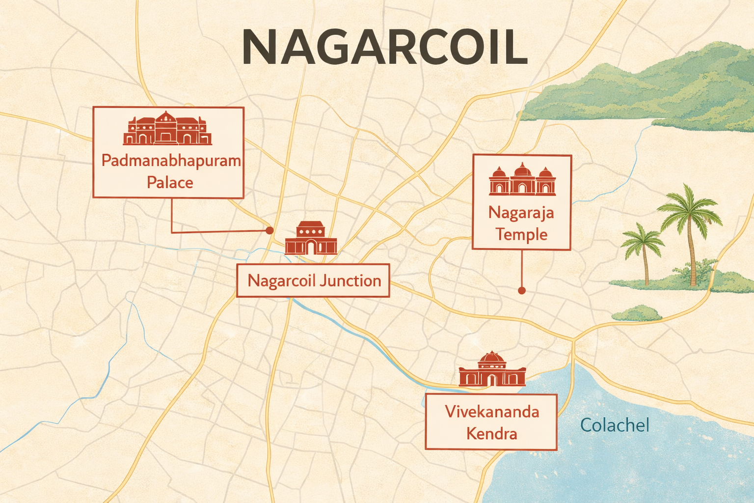 Nagarcoil Junction-The main railway hub of the city, connecting Nagarcoil to major destinations across Tamil Nadu and Kerala.
